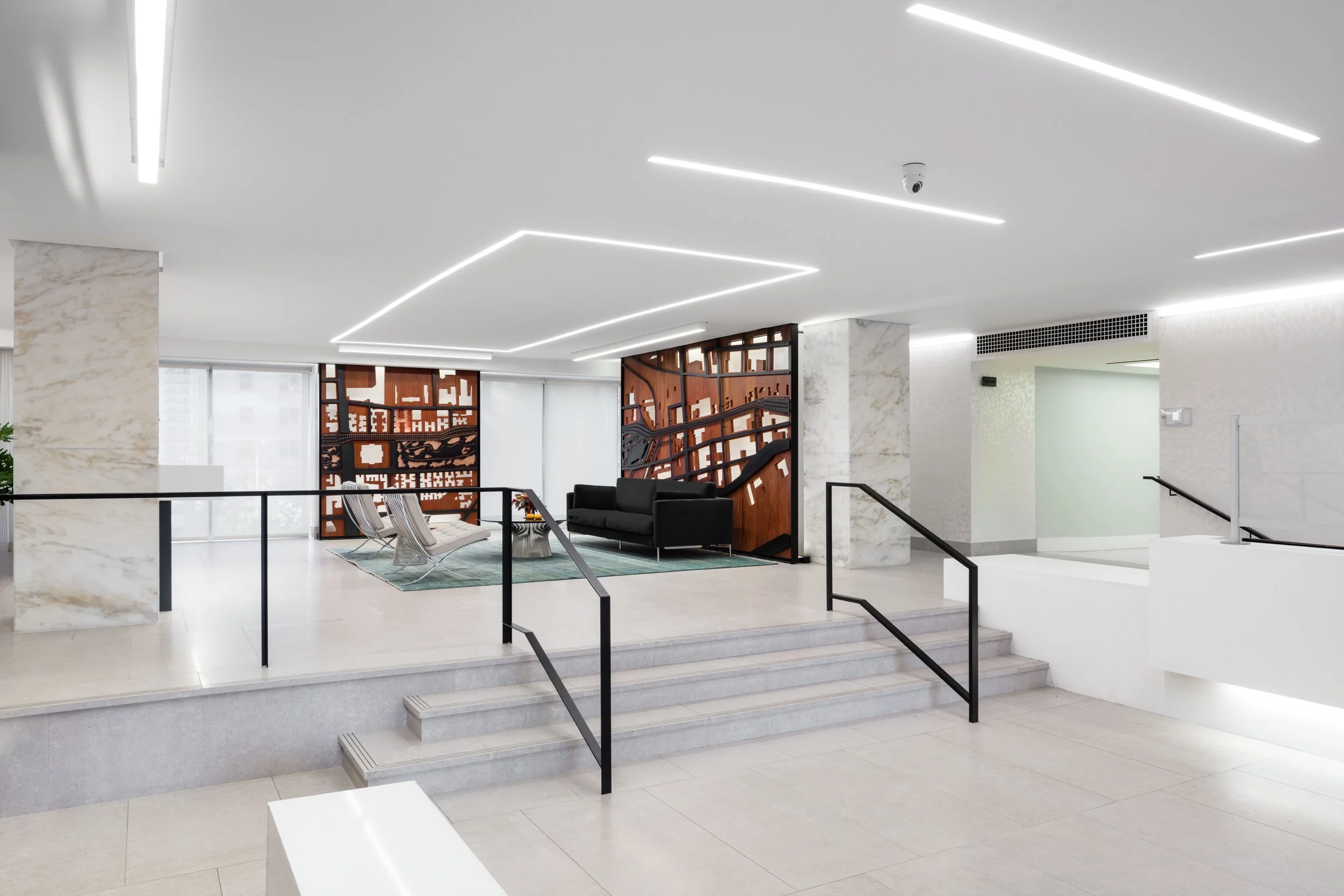 STUDIO V dramatically renovated the lobby on the ground level of the 1954 building, both updating and introducing contemporary designs that reflects the specific character of Grand Concourse. The new lobby features a clean design, highlighting three custom made art pieces in wood depicting maps of the Grand Concourse neighborhood.
