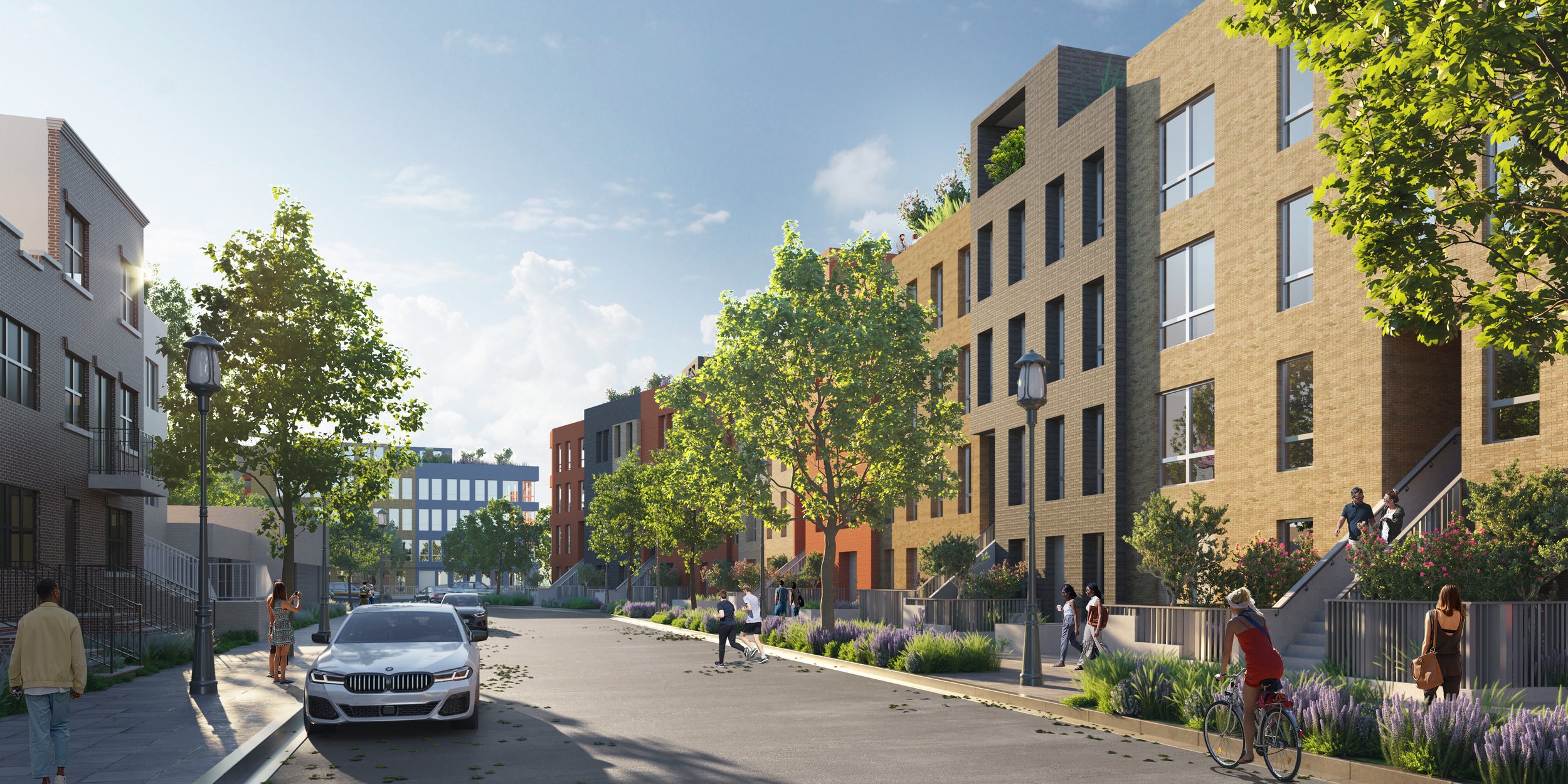 When complete, the project will provide the Borough Park community with 267 residences, 80 of them being affordable housing. With future city implementation of this design, it could result in over 4,000 new residential units. It was essential for the project to ensure that family-size apartments of 3 and 4 bedrooms were included in the affordable units, as well as additional commercial space at one end of the site for local independent businesses. A linear “green alley” network of pedestrian green spaces defined by distinctive arched openings through the buildings also provides enhanced connectivity within the project and connections into the surrounding neighborhood.