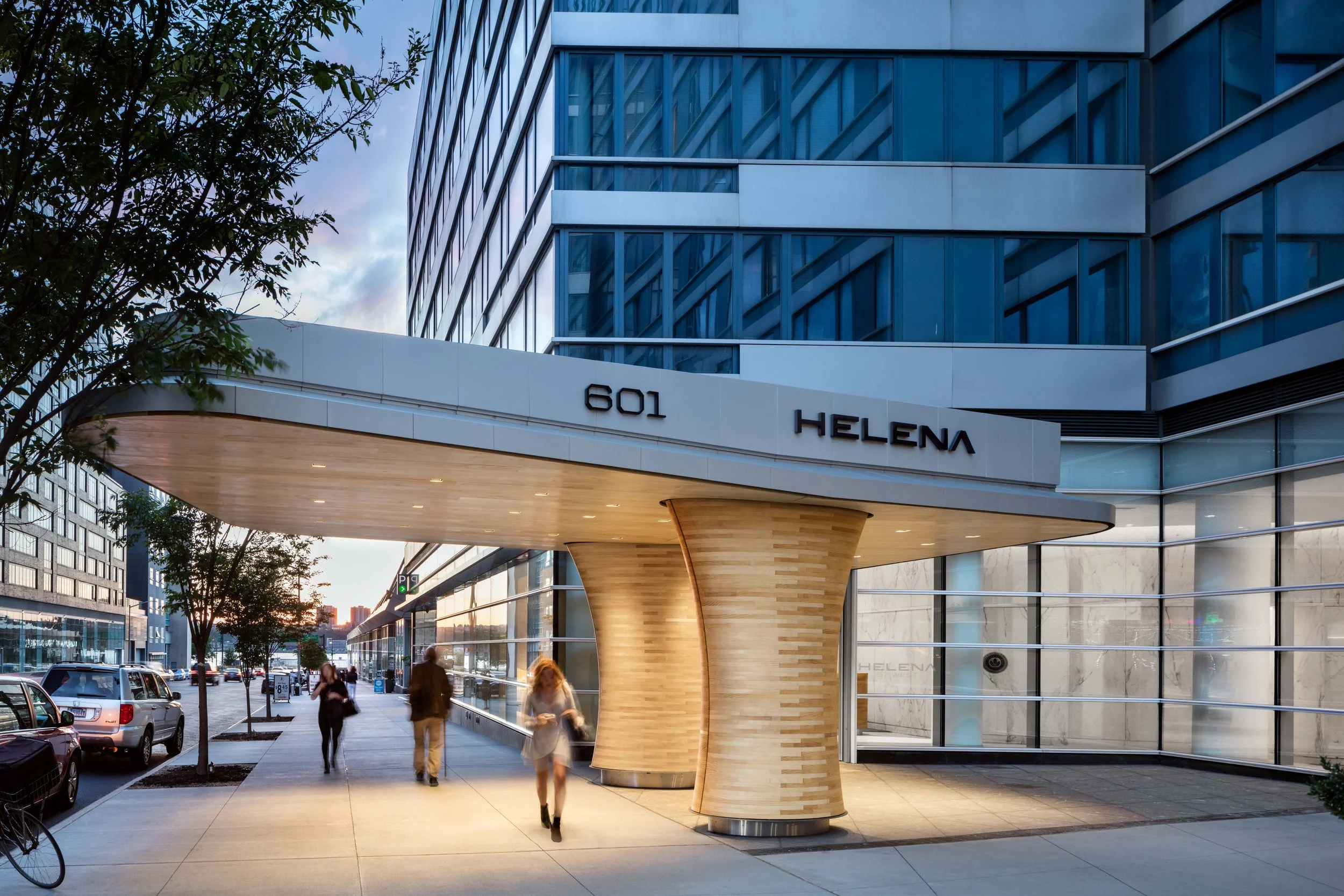 STUDIO V redesigned the lobby at Helena 57 West in collaboration with SITU Studio. The new lobby is defined by a stack-laminated wooden form fabricated by SITU Studio from 4,000 board feet of Accoya pine. The canopy curls upwards from its base, sweeps across the lobby ceiling and cuts through the building envelope to create a portico. Residents and visitors are greeted by a monumental wooden canopy which arches upward from a sculptural bench-like fixture located along the lobby’s far wall. Sweeping back across the ceiling, the canopy pierces the building envelope to form a portico over the entryway. A number of custom features are integrated throughout the canopy, including built-in overhead and accent lighting, structural column enclosures and steel toe kicks. The lobby’s twenty-foot-long reception desk runs parallel to the overhead form, sharing its materiality and curves, and transforming the space.