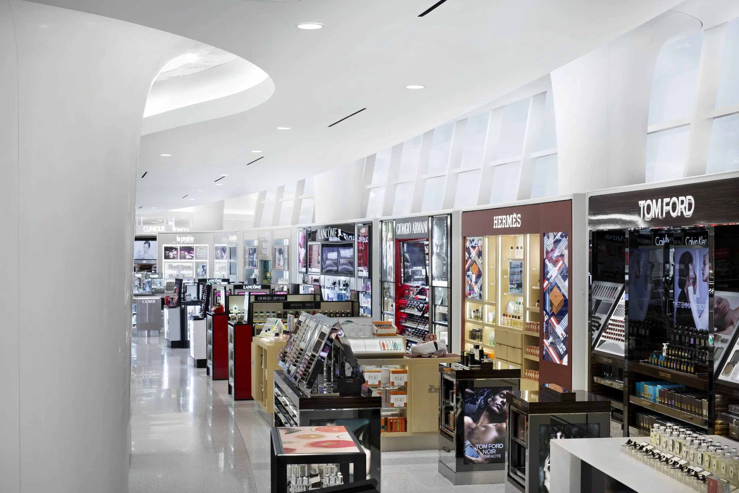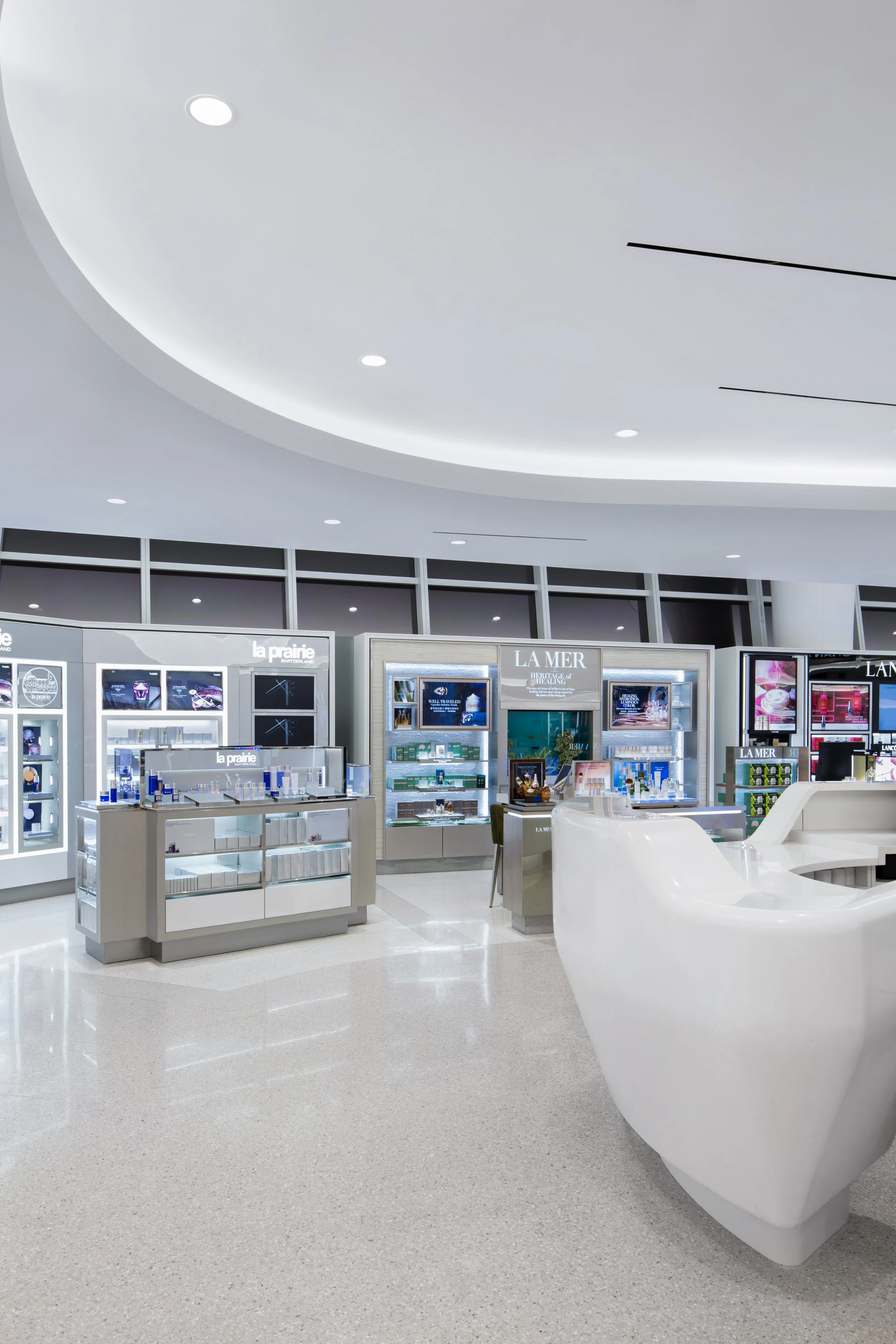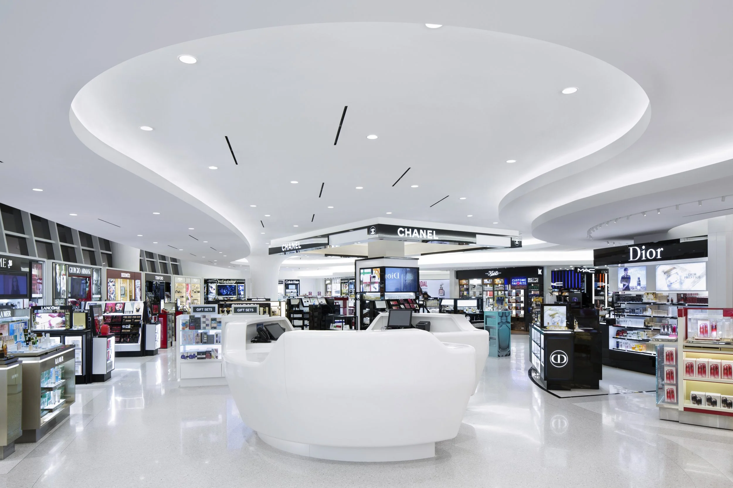 STUDIO V Architecture designed a new flagship Duty Free shop in Terminal 1 of JFK International Airport. The design integrates contemporary architectural elements with high-end interior finishes. Sleek curving forms on the ceilings and floors move people through space with a seamless flow, while displays draw them into shop among top-notch retail brands. Curvilinear, free standing gondolas and cash wraps seamlessly integrate technology and create a modernized shopping experience. This space is designed to feel endless: innovative lighting illuminates the entirety of the space, while unobstructed sight lines, reinforced by exposing the terminal’s glass curtainwall, flood the space with natural light. While the space is open, changes in flooring and displays allow individual brands to maintain their identity. The shapes recall the futuristic, fluid forms of the iconic TWA terminal at JFK, but add contemporary detail to ensure the space is a perfect blend of the past, present and future.