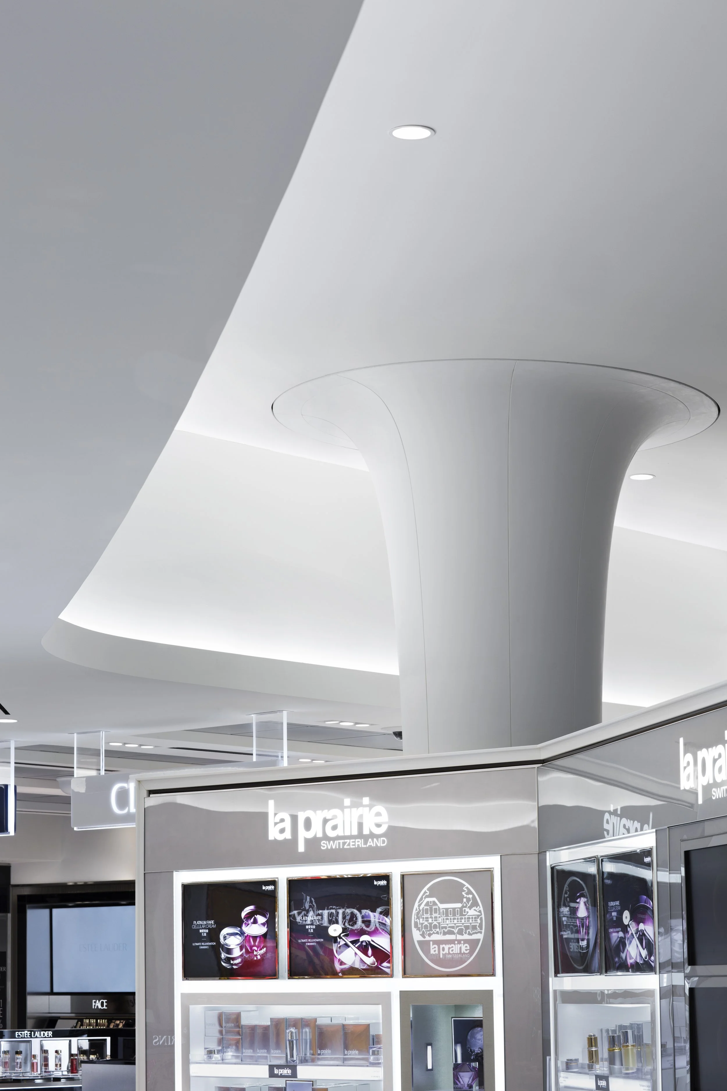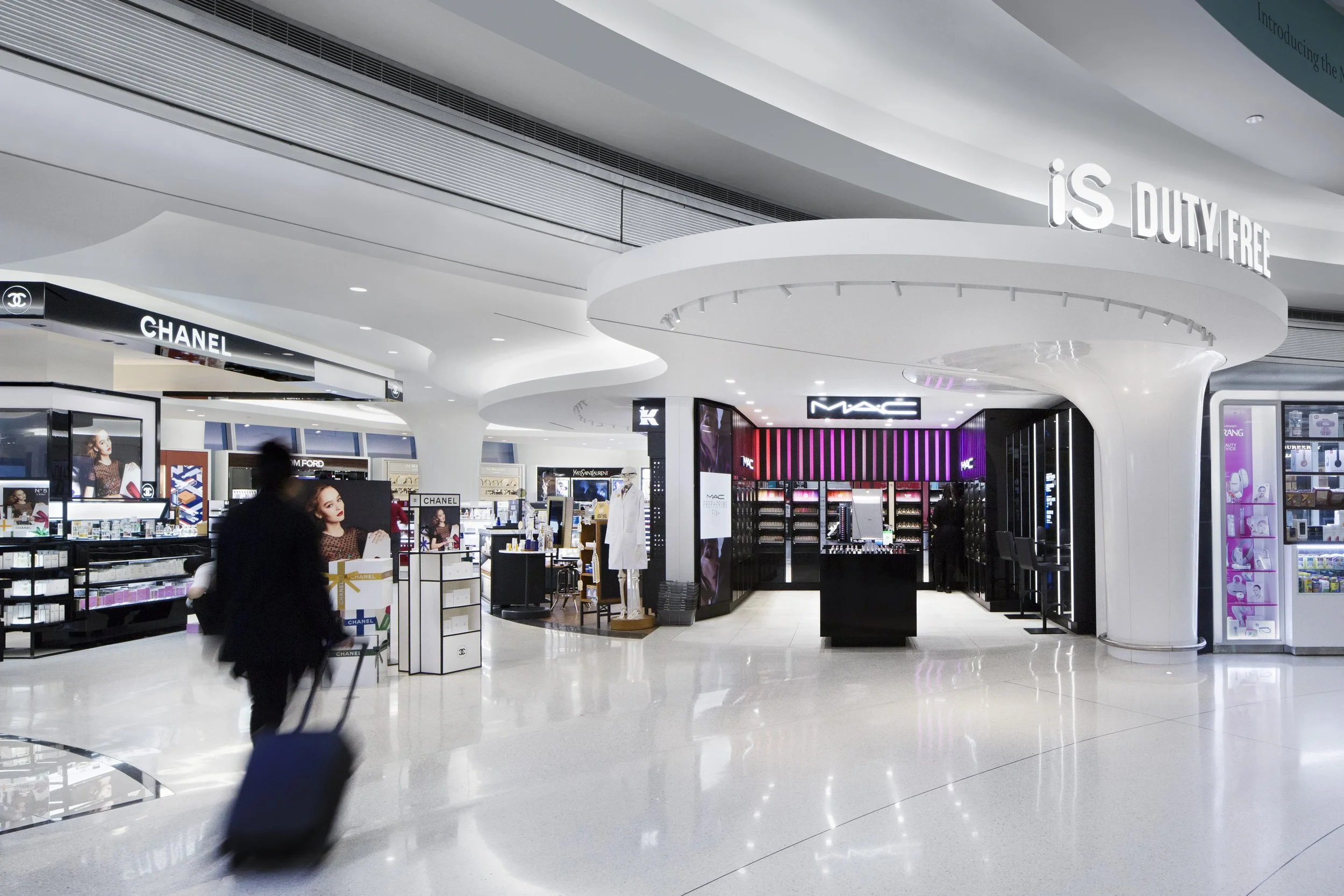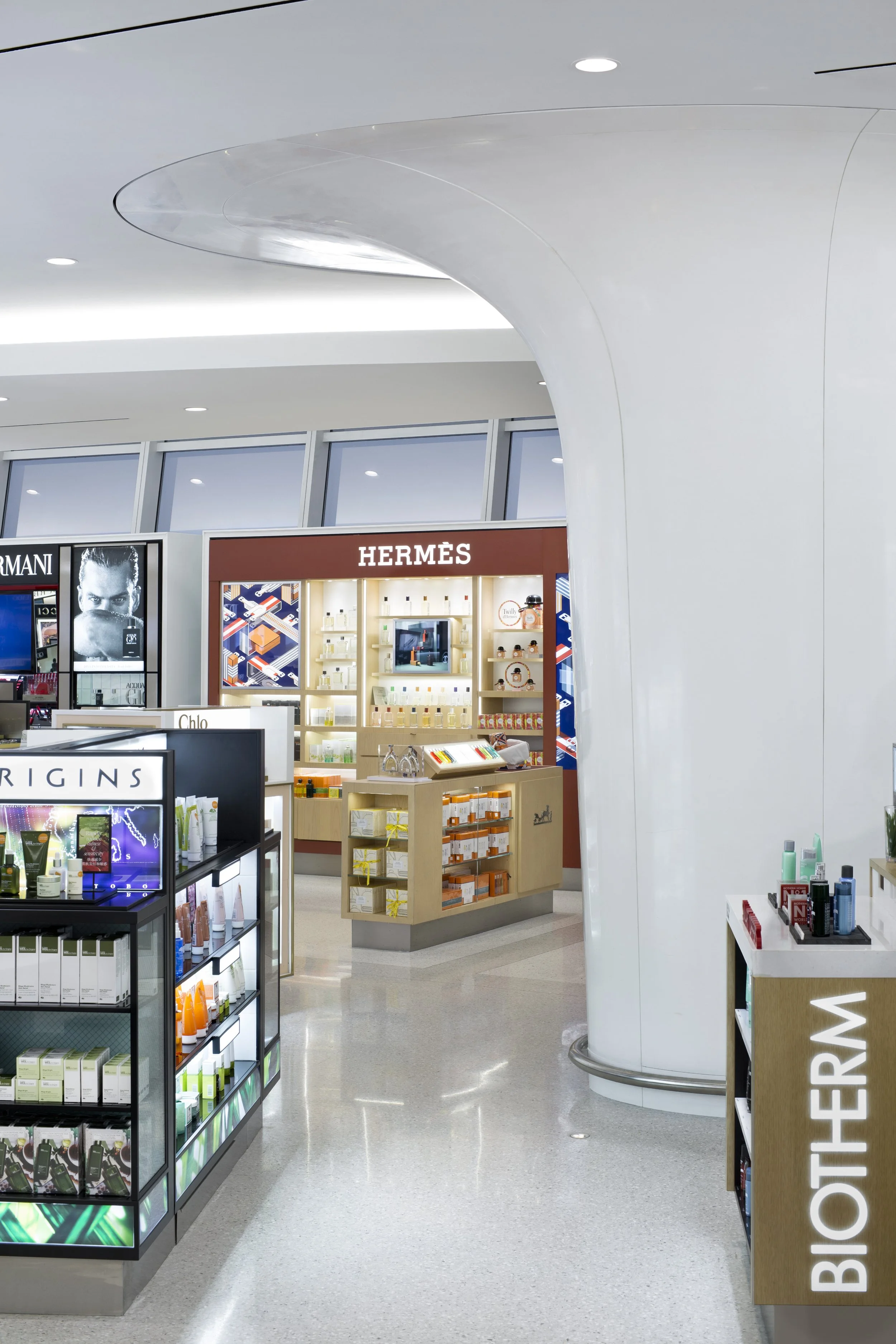 STUDIO V Architecture designed a new flagship Duty Free shop in Terminal 1 of JFK International Airport. The design integrates contemporary architectural elements with high-end interior finishes. Sleek curving forms on the ceilings and floors move people through space with a seamless flow, while displays draw them into shop among top-notch retail brands. Curvilinear, free standing gondolas and cash wraps seamlessly integrate technology and create a modernized shopping experience. This space is designed to feel endless: innovative lighting illuminates the entirety of the space, while unobstructed sight lines, reinforced by exposing the terminal’s glass curtainwall, flood the space with natural light. While the space is open, changes in flooring and displays allow individual brands to maintain their identity. The shapes recall the futuristic, fluid forms of the iconic TWA terminal at JFK, but add contemporary detail to ensure the space is a perfect blend of the past, present and future.