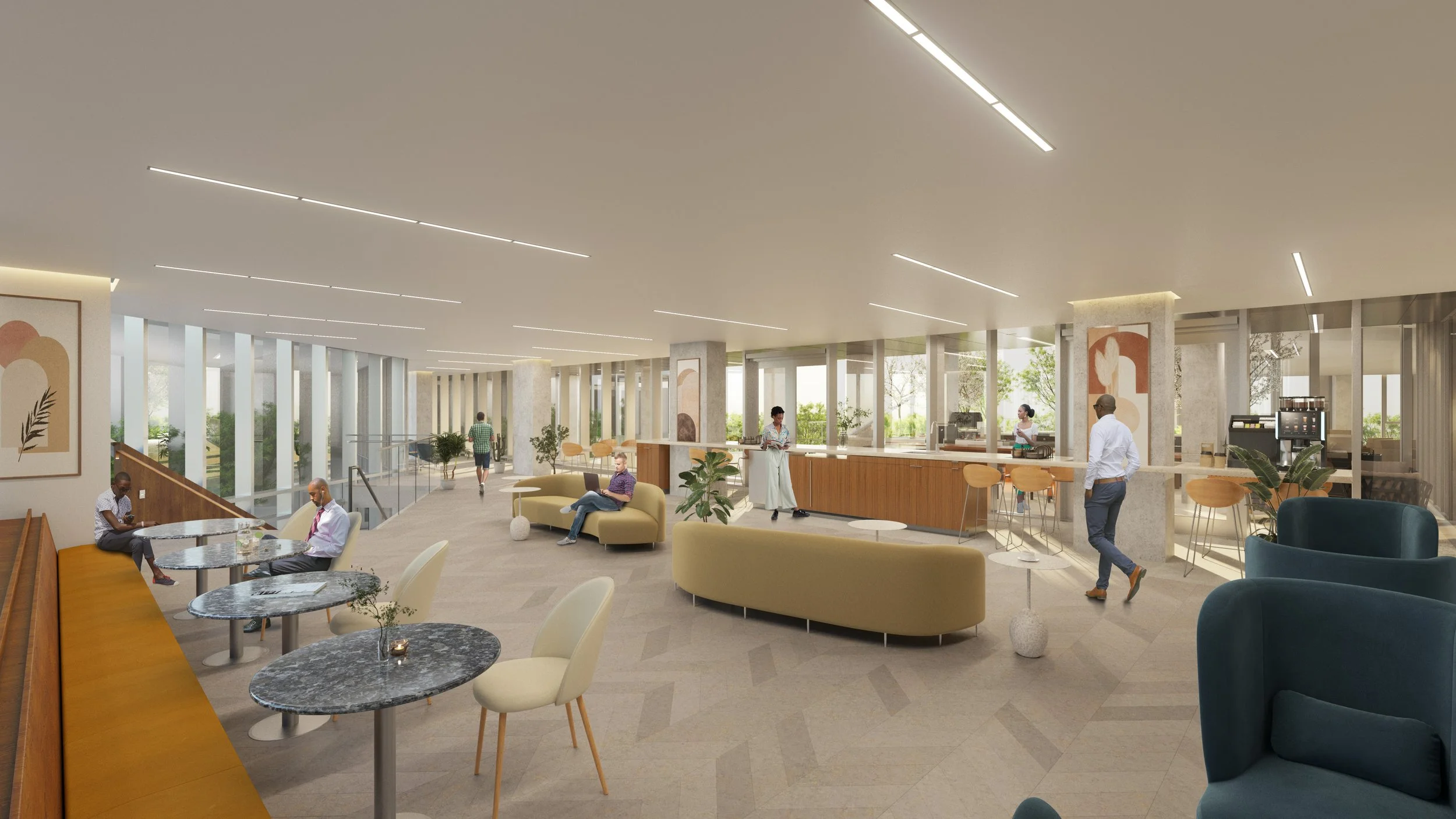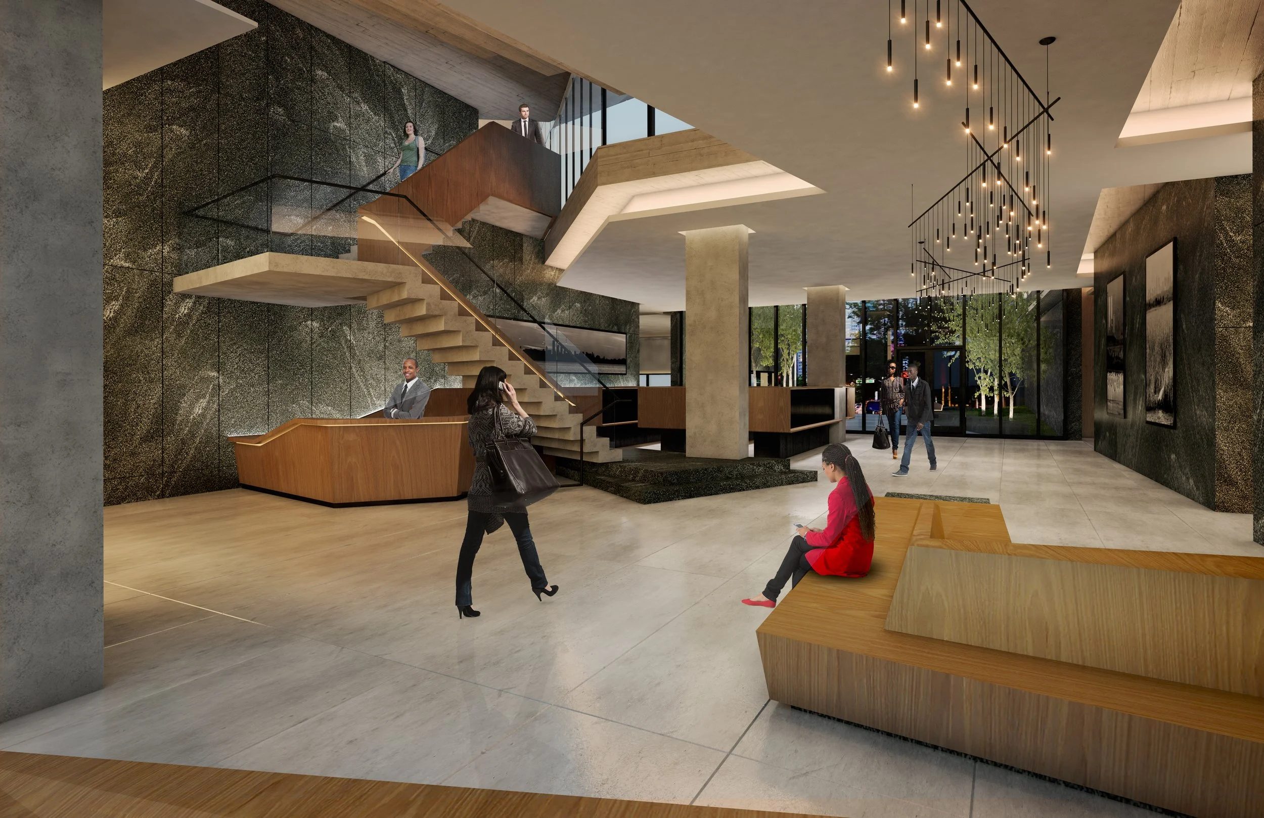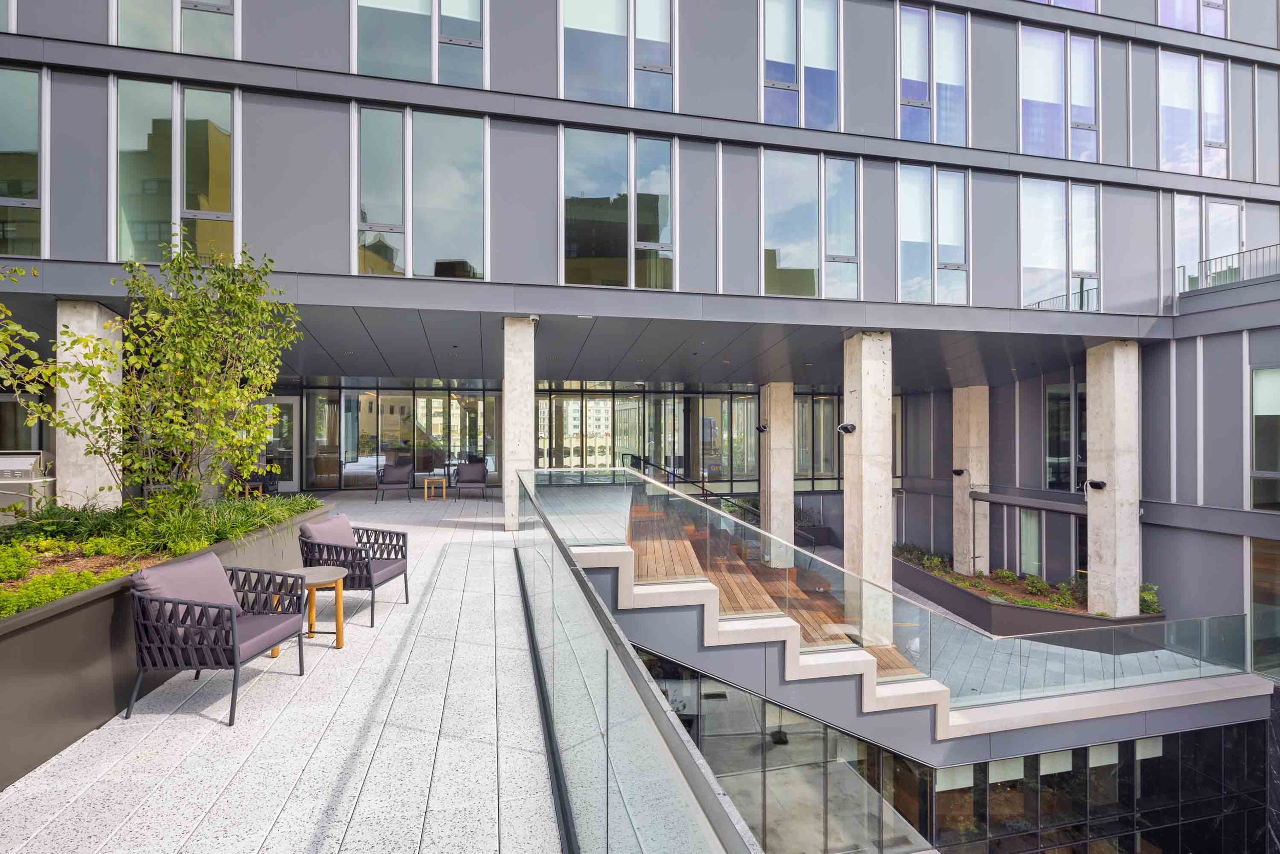 Residents enter through a ground-floor garden leading to a lobby with a custom, poured in place, grand staircase that sets the tone for the building’s design. The garden theme continues throughout the building, connecting to various amenities like a gym, yoga studio, and family room, and culminating in a rooftop lounge with panoramic views of Manhattan. The rooftop garden’s plant palette reflects the native species of the surrounding Jamaica parks, enhancing the sense of community.