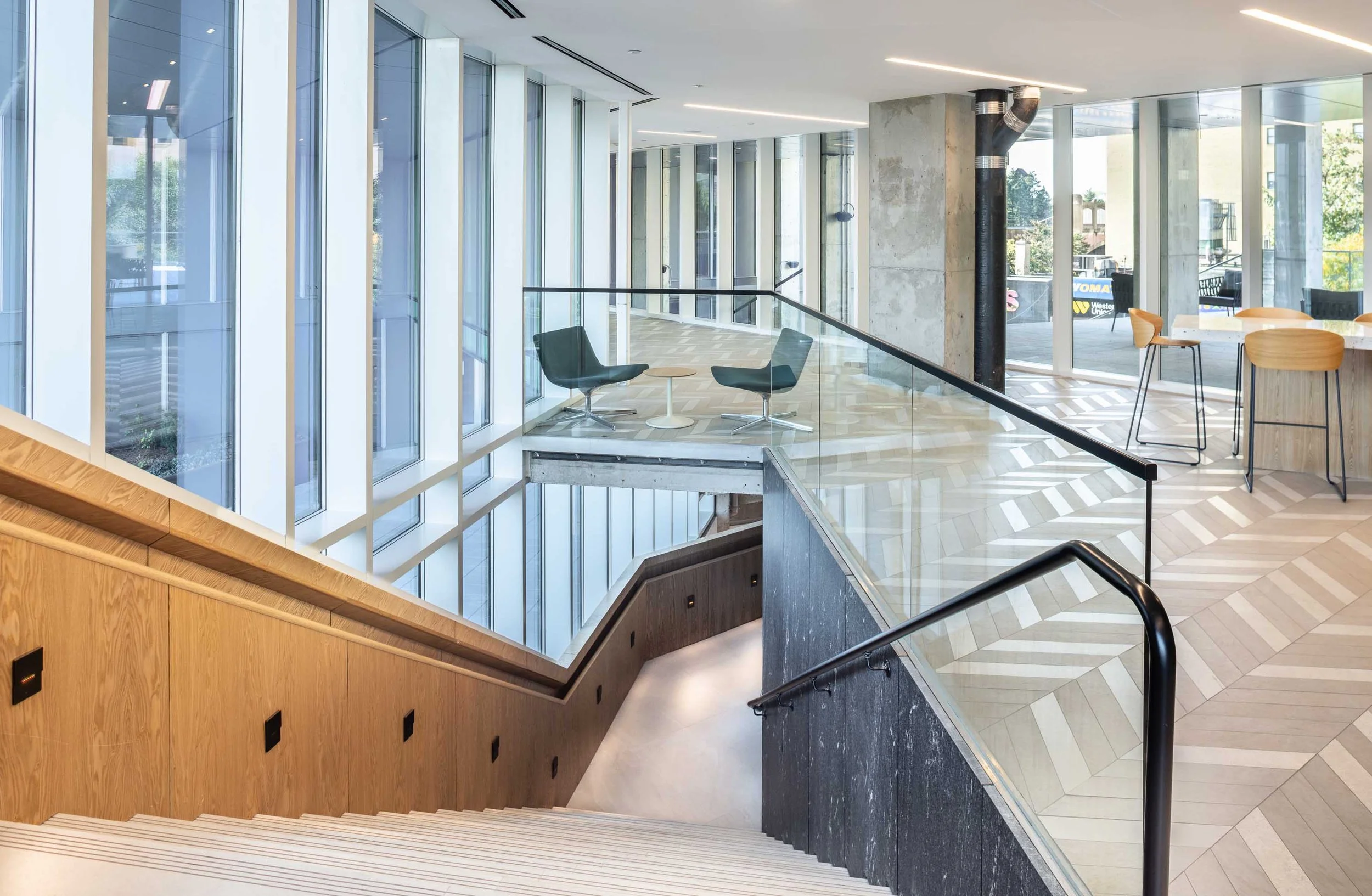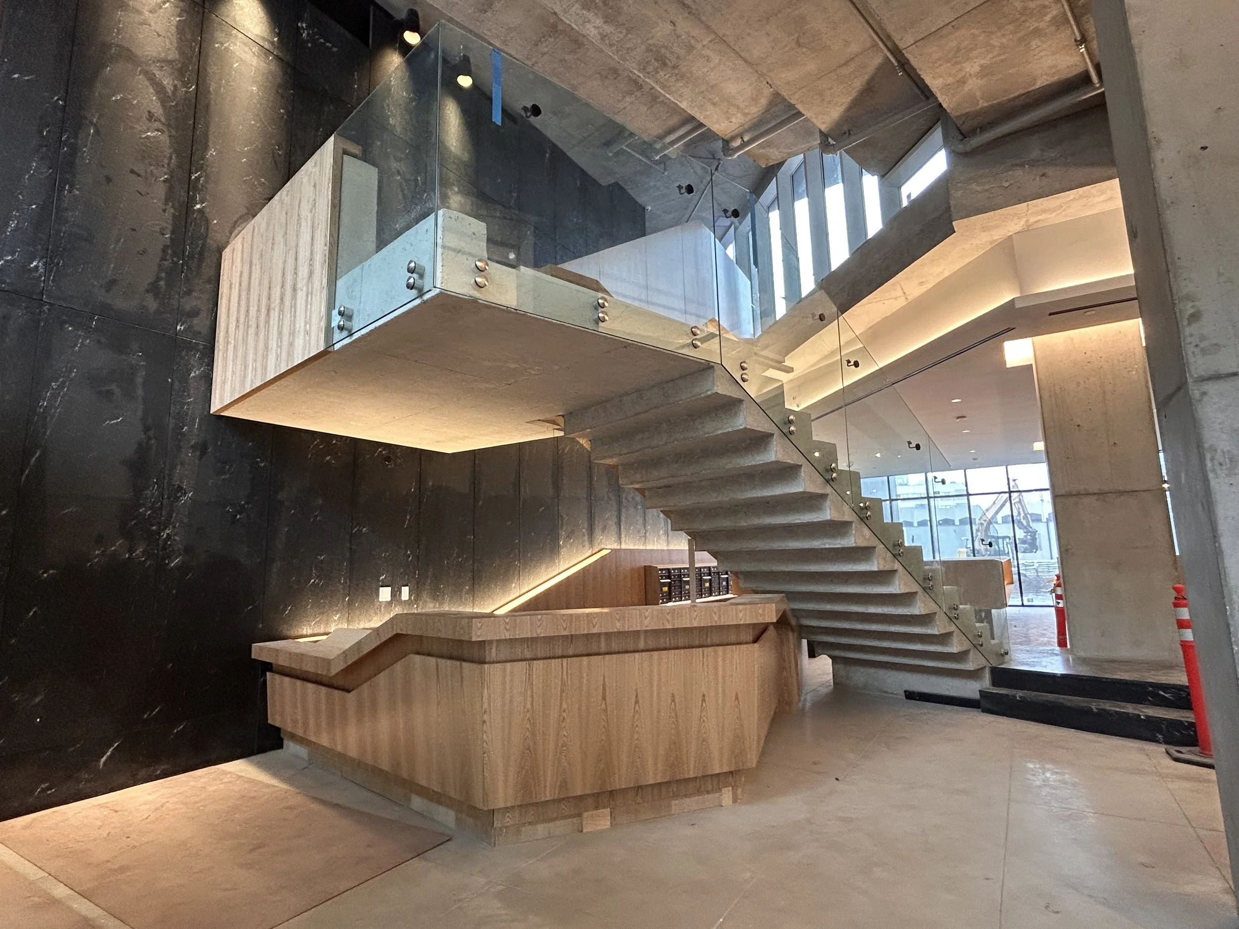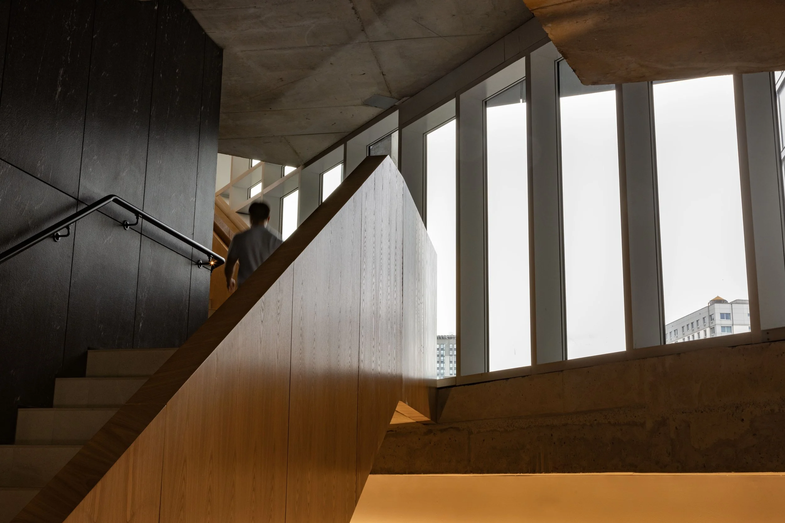Residents enter through a ground-floor garden leading to a lobby with a custom, poured in place, grand staircase that sets the tone for the building’s design. The garden theme continues throughout the building, connecting to various amenities like a gym, yoga studio, and family room, and culminating in a rooftop lounge with panoramic views of Manhattan. The rooftop garden’s plant palette reflects the native species of the surrounding Jamaica parks, enhancing the sense of community.