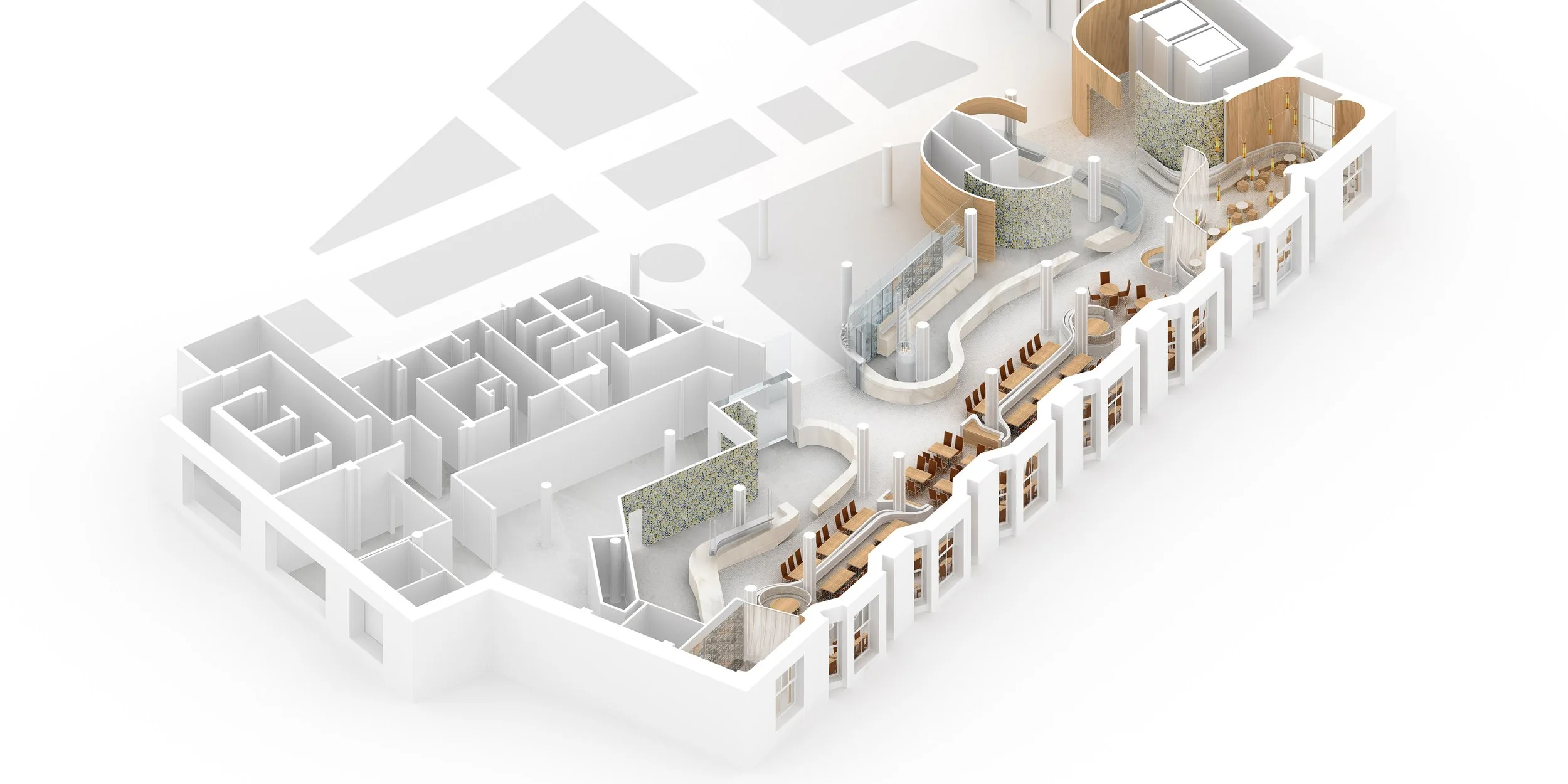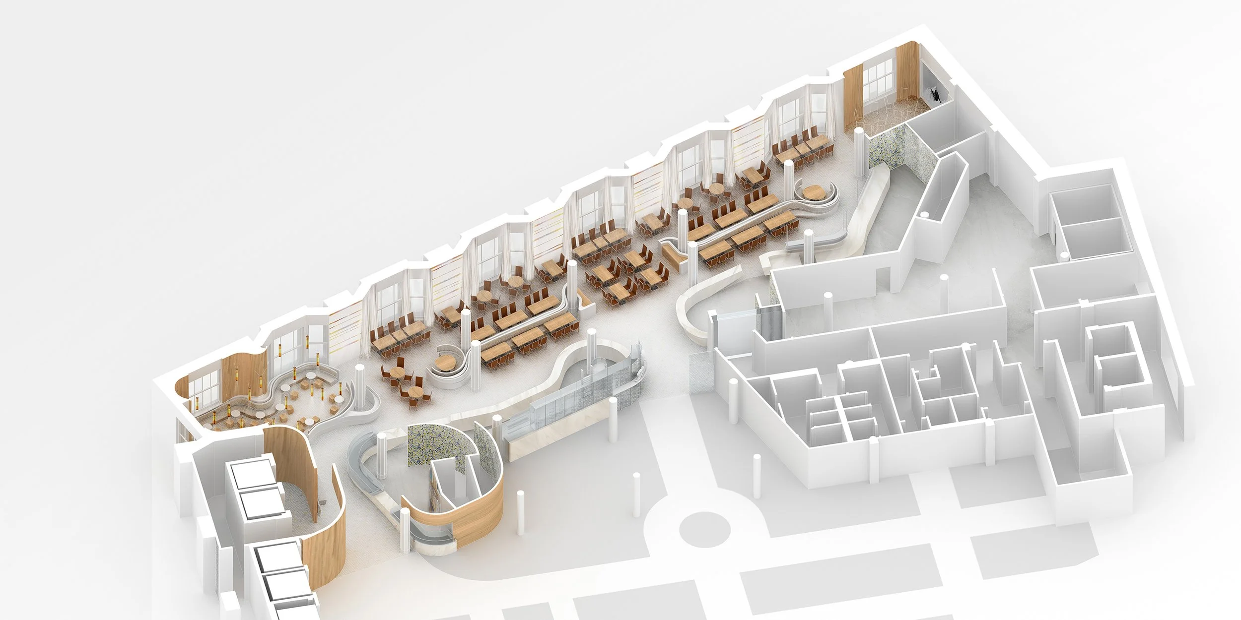 The design is built on the concept of celebrating outstanding and creative Italian food. New York City’s longest bar (in the world’s largest store) features an overlapping series of food concepts and experiences: “cibi ronda” food displays, a gellateria, prosecco bar, pizza making, a dining bar to watch the chefs prepare dishes, an Italian wine bar, and private dining room and wine cellar. Uniquely Italian design concepts are interpreted in a contemporary way: a computer milled “crema delicata” white marble and stainless-steel bar wraps around the entire space with a series of sensual three-dimensional sculptural curves to accommodate each different food related experience.