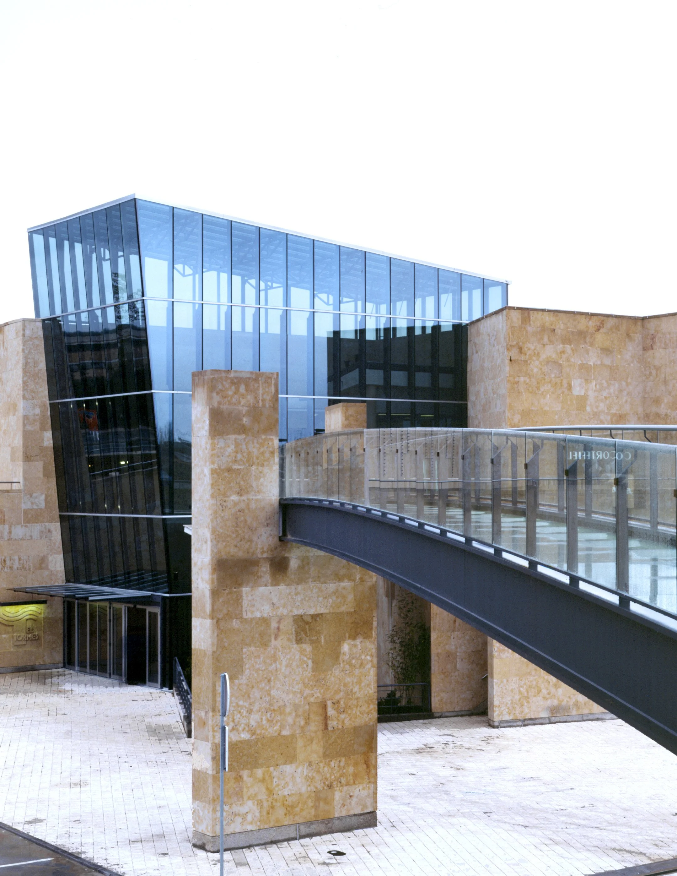 Salamanca is also famous for her bridges. This tradition has been interpreted with a delicate glass and steel bridge at each entrance, providing a dramatic focal point for lighting at night. The selection of materials bridges old and new, using the local golden sandstone punctuated by a contemporary system of glass and steel.